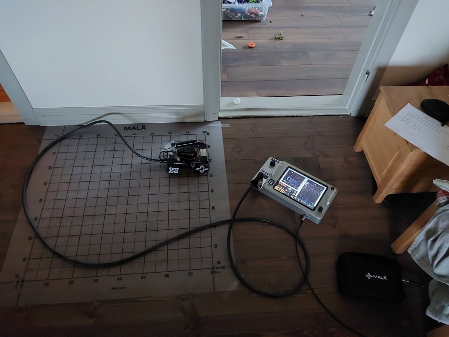 For easy and efficient field work a grid mat was used, with 5 cm between both vertical and horizontal lines. The data collection of the area of interest ( 1 × 2 meters floor and 1 × 1 meter wall) were measured in total 30 minutes. Data was processed onboard the CX system for a first check and then transferred to MALÅ Vision for a more thorough post-processing. In a few minutes a 3D volume was created, and a resulting time slice ready.