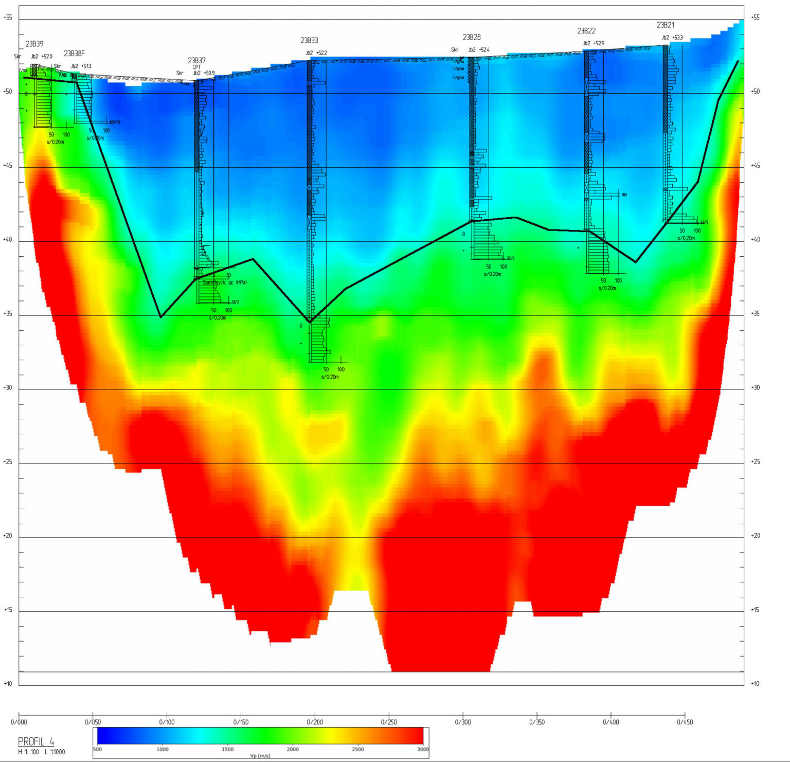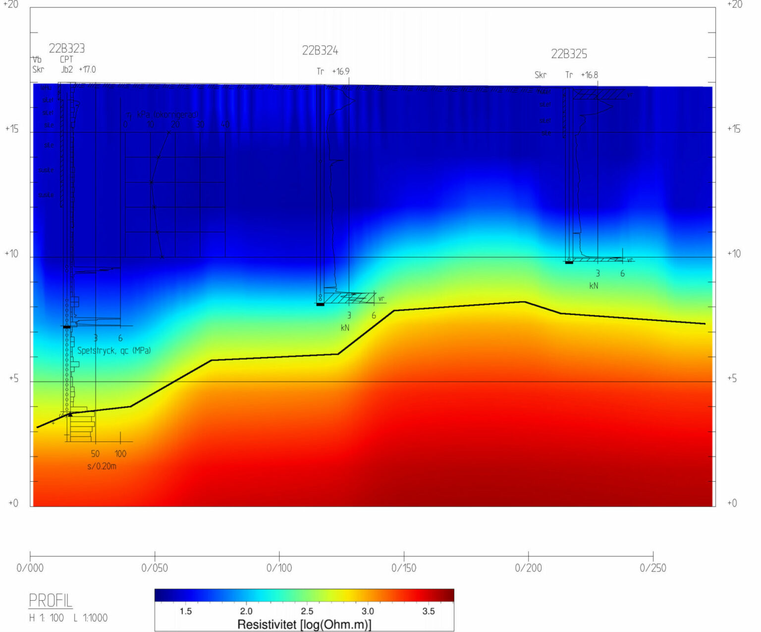 Figure 1. Resistivity profile displayed together with geotechnical soundings. The black line represents the interpretation of the bedrock level