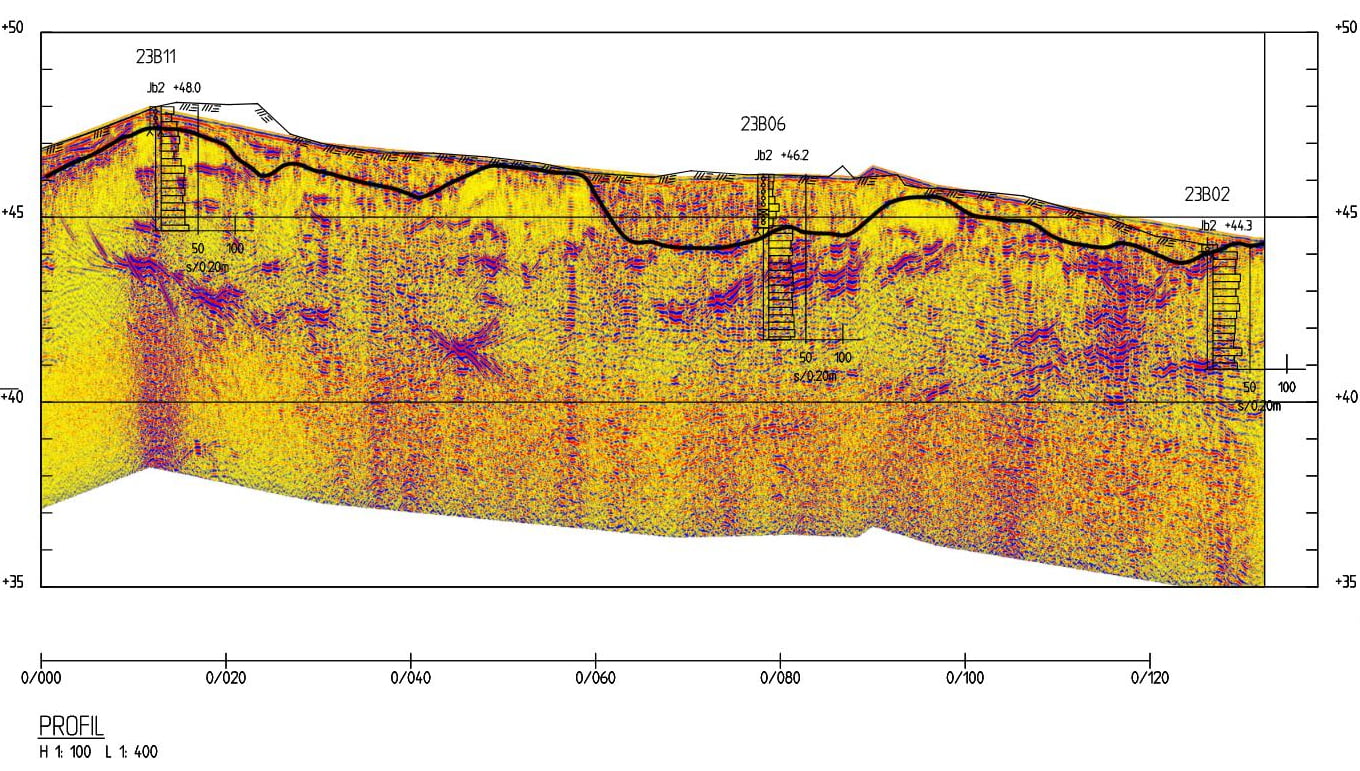 Figure 4. GPR measurements and geotechnical drillings at one and the same place from example 2