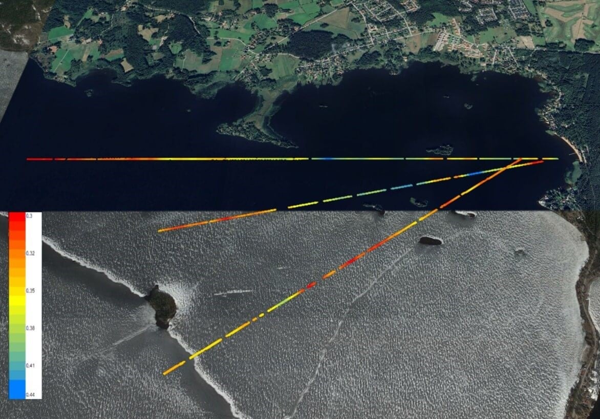 To be able to cover long stretches of ice in a safe and efficient way, a drone-based GPR solution was chosen. This enabled measurements to be taken early in the season and on unknown parts of the lake, without risk for personnel or material. The ice was estimated to be less than 1 meter in thickness, which is suitable for the MALÅ GeoDrone 600 antenna.