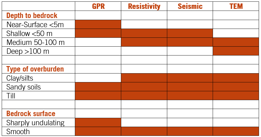 he table below is a good starting point to choose between the different geophysical methods available from Guideline Geo. More information on the different methods can be found here: