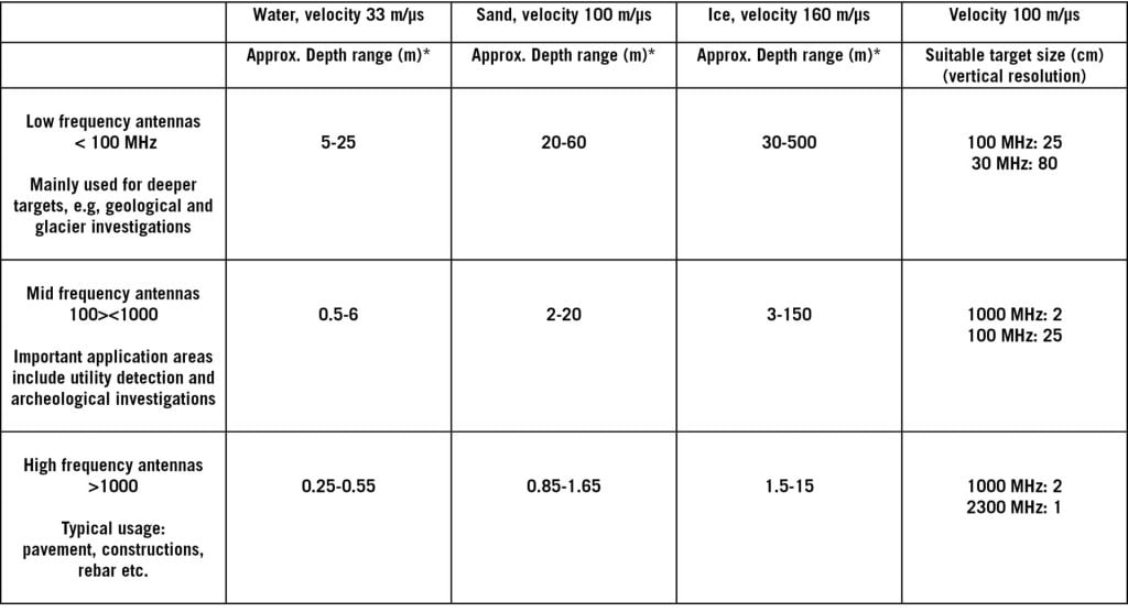 *The values for the approximate depth are calculated by the assumption that in ideal conditions, the maximum depth of penetration before the full energy of the transmission is lost is 20 wavelengths or less. Please note that any obstacles (i.e. rebars or objects in the investigated material will potentially reduce the potential depth penetration of an antenna). The potential maximum depth of antenna also depends on maximum time window of that specific instrument (see text below).