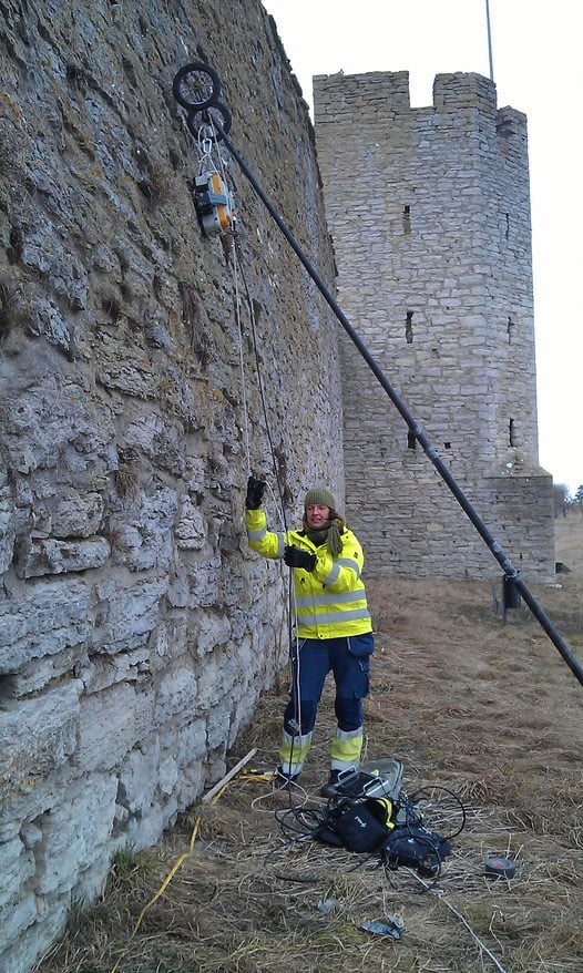 - … you can investigate huge masonry walls for loose stones? But do not try to use a sky-lift in heavy winds. It was easier to carry out GPR measurements using a home-built lifting device instead.