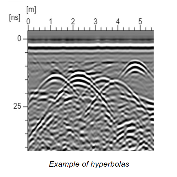 | As you saw in the example above, utilities form hyperbolas in GPR data. And the location of the object creating the hyperbola is exactly on the apex, and nowhere else. These are most often quite clear and easy to identify. But sometimes conditions cause a lack of clarity, data are hard to interpret and you may have collected mile after mile of profiles. Wouldn´t it be nice to have an assistant picking all these hyperbolas in an effortless way? Or make you more aware of when you pass something interesting? |