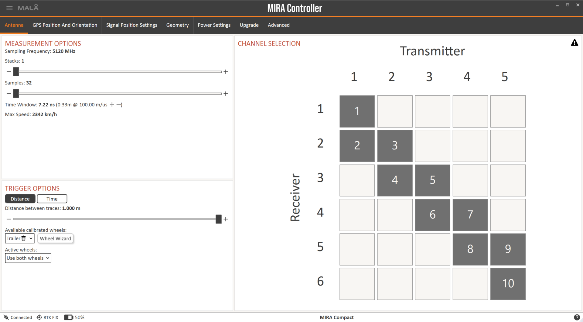 The MIRA Compact GPR array uses a 500 MHz centre frequency, The system is normally set up to collect 10 parallel data channels but the system is capable of collecting up to 30 data channels simultaneously since it allows data collection from any transmitter-receiver combination in the whole array.